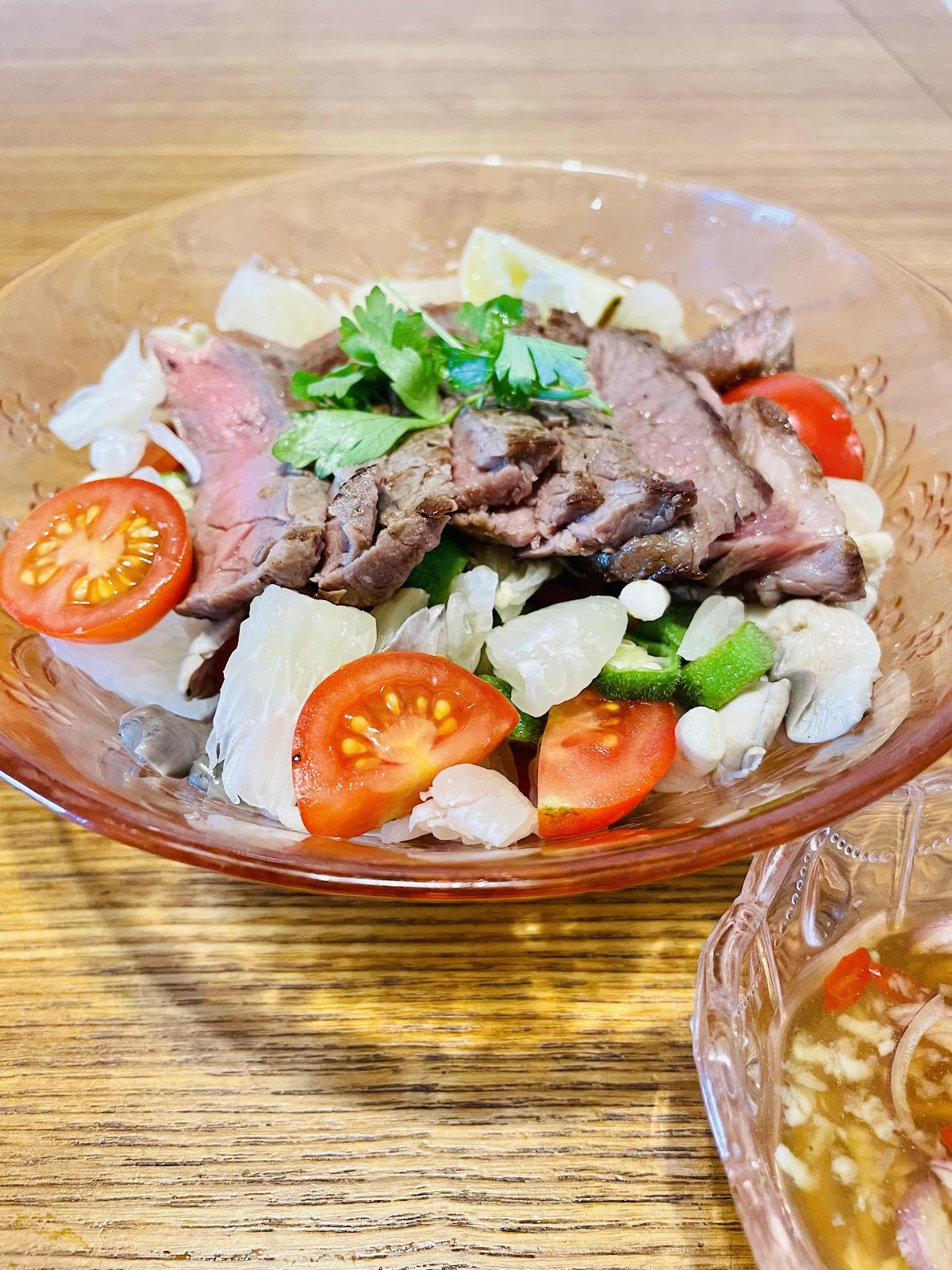 材料好簡單,除了柚子,其實自己喜歡什麼加什麼,我加了車厘茄、秀珍菇、秋葵。